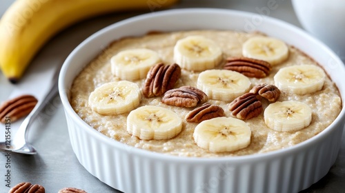 A delectable dish of banana pecan oatmeal in a white bowl offers comfort and warmth of a homemade breakfast.