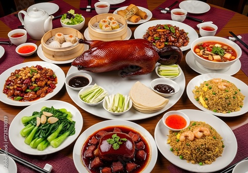 A delectable spread of chinese cuisine featuring peking duck and various dishes for a feast