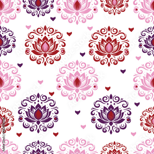 A delicate pattern featuring ornate floral motifs in shades of pink, purple, and red, complemented by small hearts.