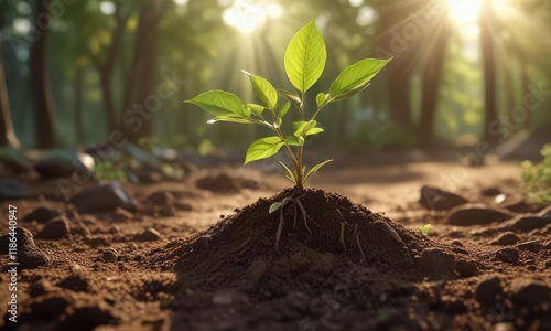 A delicate sapling pushing its way up through the soil with morning sunbeams shining down on it, sprout, landscape, outdoor