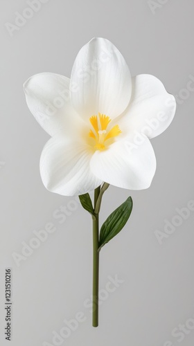 A delicate white flower with a yellow center and green leaves, set against a neutral background.