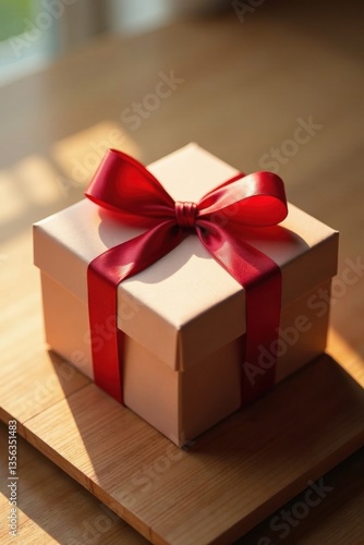 A delicately wrapped gift box, adorned with a vibrant red ribbon, rests on a smooth wooden surface, bathed in warm sunlight.