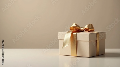 gift, present, box, ribbon, gold, beige, cream, elegant, luxury, celebration, surprise, special occasion, holiday, anniversary, birthday, wedding, gratitude, appreciation, thoughtful, festive, sophisticated, simple, minimalist, stylish