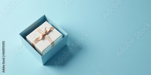 A delicately wrapped present nestled within a light blue box, a symbol of thoughtful gifting and joyous celebration
