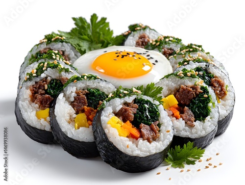A delicious arrangement of Korean kimbap rolls surrounds a fried egg garnished with sesame seeds and parsley on a white background.