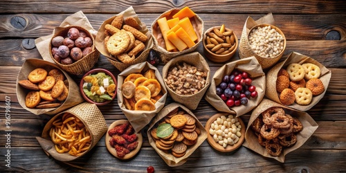 A delicious assortment of gourmet snacks, including crackers, nuts, and dried fruits, neatly arranged in eco-friendly paper packaging on a rustic wooden background.