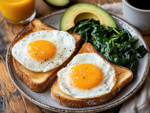 breakfast, egg, toast, avocado, spinach, healthy, meal, food, nourishment, morning, dish, cookery, cooking, epicure, delicious, brunch, protein, vitamin, organic, homemade, simple, fresh, appetising, vibrant, yellow, green, plate, fork, knife, serving, table, rustic, wood, beverage, orange, juice, hot drink, energy, favor, comfort, lifestyle, eating, ingredient, culinary, presentation, satisfying, wholesome, balanced, vegetarian