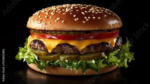 burger, food, meal, sandwich, sesame, bun, meat, beef, patty, cheese, tomatoes, pickle, lettuce, greener, condiment, sauce, yellow, red, green, round, tasty, delicious, juicy, fresh, stacked, layered, isolated, close, up, detail, texture, macro, studio, dark, background, culinary, cookery, fast, eat, dinner, lunch, side, ingredient, epicure, vegetable, crispy