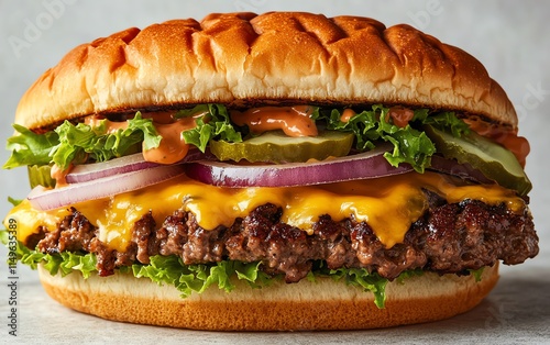 A delicious cheeseburger with layers of melted cheese, fresh onions, crisp lettuce, juicy tomatoes, cucumbers, and tangy sauce