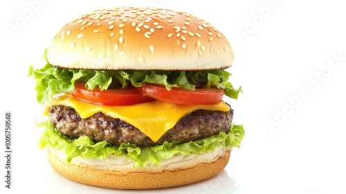 A delicious gourmet burger stacked high with fresh lettuce, juicy tomatoes, and melted cheese, presented on a clean white background for a mouthwatering appeal.