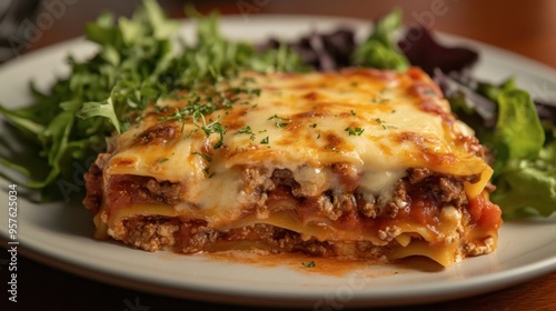 A delicious homemade lasagna with layers of pasta, marinara sauce, ground beef, and melted cheese, served with a side salad.