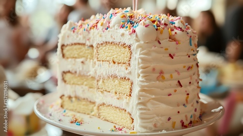 A delicious, layered cake, frosted with creamy white icing and vibrant sprinkles.