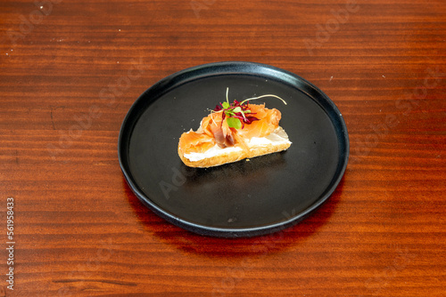 A delicious pincho served in a Spanish restaurant with cream cheese and Norwegian salmon