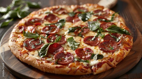 pizza, pepperoni, basil, cheese, crust, meal, food, italian, dinner, slice, fresh, savoury, culinary, herb, tomatoes, sauce, bake, oven, share, party, snack, dining, epicure, favor, receipe, crusty, warm, comfort, indulgence, crispy, appetising, ingredient, round, wooden, platter, delicious, presentation, eatery, homemade, casual attire, eat, enjoy, feast, table, cookery, seasoning, aroma