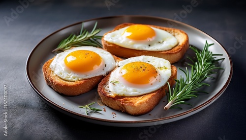 a delicious plate featuring three fried eggs on toasted bread garnished with fresh rosemary creating a visually appealing breakfast dish
