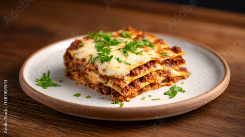 A delicious serving of vegetarian lasagna topped with fresh herbs on a rustic plate. white 27871541 1