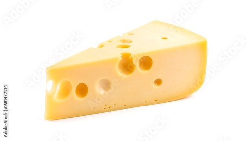cheese, dairy, food, foodstuff, food and drink, wedge, triangle, hole, emmental, yellow, creamy, delicious, appetising, snack, ingredient, culinary, epicure, food photography, studio shot, isolated, white background, dairy product