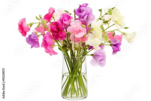 A Delightful Array of Colorful Sweet Pea Flowers in a Clear Vase on Transparent PNG Background.