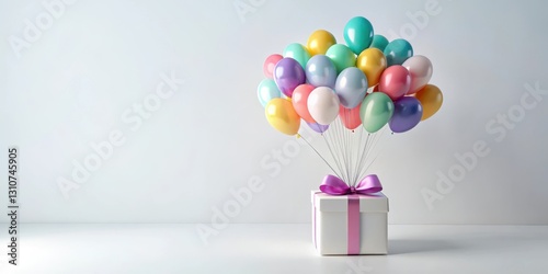 A delightful array of pastel balloons lifts a pristine white gift box, tied with a delicate lilac ribbon, creating a whimsical scene of festive celebration