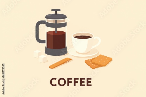 A delightful coffee still life featuring a French press, cup, sugar, biscuits, and stick