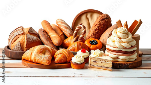 bread, pastry, croissant, loaf, cake, cupcake, dessert, sweet, baked, good, food, treat, wooden, table, display, arrangement, delicious, fresh, epicure, artisan, bakery, assortment, confection, sourdough, baguette, icing, cherry, white, isolated, still life, culinary, nourishment, snack, sugar, flour, wheat, crust, brown, orange