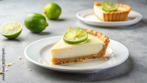 A delightful slice of creamy lime tart, garnished with a fresh lime wedge, rests on a pristine white plate, accompanied by whole limes and a hint of white chocolate shavings.