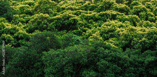 A dense canopy of trees fills the frame, showcasing varying shades of green. Sunlight highlights the textured leaves, creating a vibrant and lush natural scene.