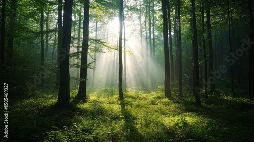 A dense, green forest shrouded in fog with sunbeams, located in Osnabruck, Germany