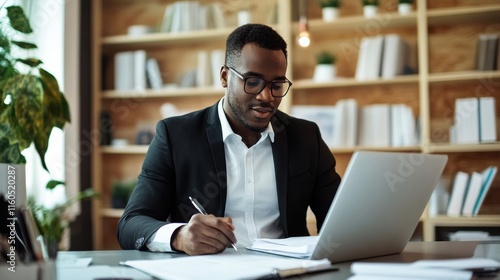 A dentist seated at a desk reviewing patient charts in a sleek and organized workspace