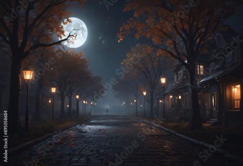 A deserted street lined with houses adorned for Halloween, lanterns casting an eerie glow. Shadows of costumed figures stretch across the road, adding to the mystical ambiance.