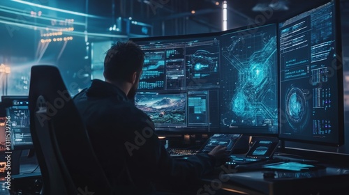 designer, creating, digital, landscape, for, new, video, game, in, high technology, studio, surrounded, by, holographic, screen, the, environment, sleek, modern, photorealistic, high, resolution