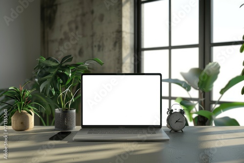 A desk setup with a laptop displaying a white mockup screen in a modern office environment
