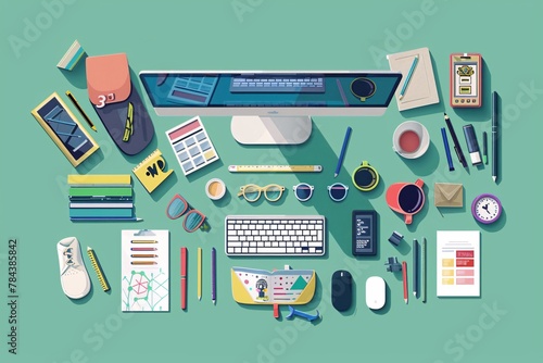 A desktop computer sits surrounded by various office supplies such as notebooks, pens, folders, and a calculator