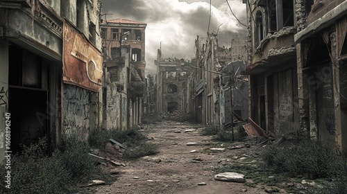 A desolate urban street scene, featuring crumbling buildings, overgrown vegetation, and a somber, cloudy sky, evoking a sense of abandonment and decay.