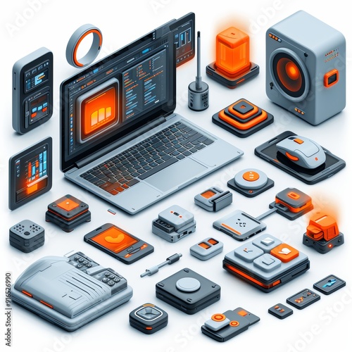 A detailed 3D illustration showcasing high-tech gadgets, including a laptop, smartphone, and various next-generation devices.