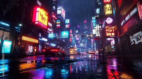 A detailed 3D night scene with neon lights and rain-soaked surfaces in a cyberpunk city