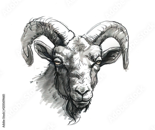 A detailed black and white drawing of a majestic ram with large, spiraling horns. Perfect for power, strength, and wildlife designs. Animals painting.