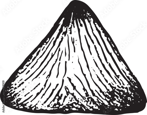 A detailed black and white illustration of a triangular object resembling a Hershey's Kiss chocolate, with intricate shading and texture that enhances its realism