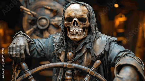 skeleton, ship, wheel, pirate, figure, dark, eerie, maritime, decor, sculpture, art, skittish, nautical, atmosphere, adventure, vintage, history, craftsmanship, mystery, fantasy, display, character, horror, theme, museum, attraction, unique, creative, haunting