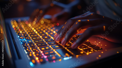 A detailed close-up of hands typing on a laptop keyboard.