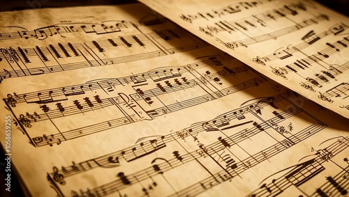 A detailed close-up of weathered sheet music, revealing the intricate details of musical notes and staff lines on aged paper. A textured image of antique sheet music. 1