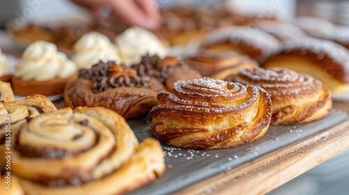A detailed close-up shot of an assortment of delicious, freshly-baked pastries arranged neatly on a tray, showcasing a variety of textures, shapes, and toppings, tempting to anyone.