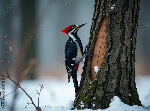 A detailed, high-resolution photo of a Dendrocopos major woodpecker hammering on a weathered tree trunk in a cold, wintry forest. Focus on the woodpecker's dynamic action and the texture of the bark.