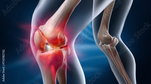 A detailed illustration of a human knee joint highlighting areas of pain and inflammation. This visual aids in understanding knee injuries, arthritis, and joint health.