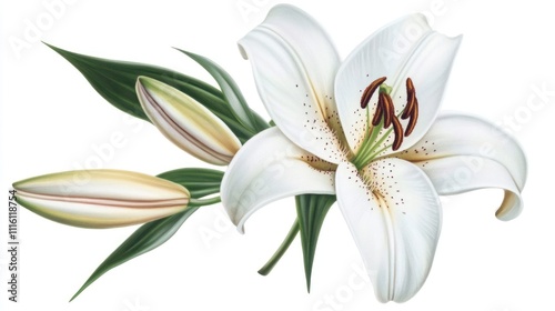 flower, lily, white, flower petals, bloom, botanical, nature, plant, leaf, bud, illustration, art, beauty, flora, garden, decorative, design, vibrant, elegance, spring, fresh, growth, organic, colours, detail, texture, arrangement, harmony, aesthetic, seasonal, calmness, peaceful, visual, bright, natural, environment, symbol, fragrance, purity, serenity, composition, artistic, graphic, delicate, style