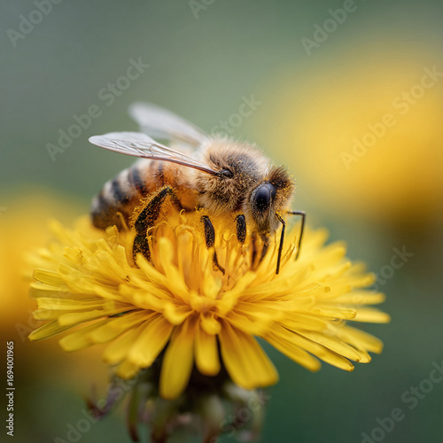 A detailed macro shot of a bee collecting pollen from a bright yellow flower. Symbolizes nature, pollination, spring, and the environment. Ideal for ecology, conservation, and organic themes.