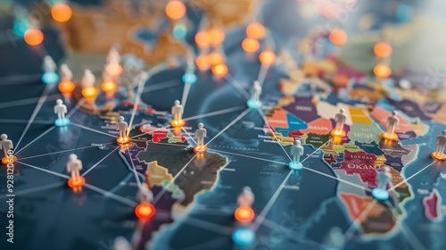 A detailed map featuring glowing lights and network connections representing global communication and connectivity.