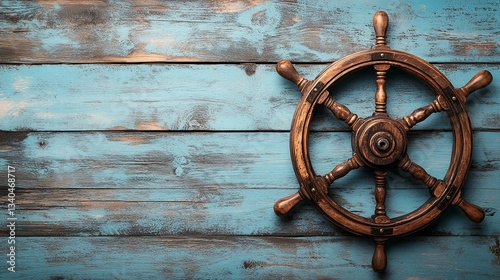 A detailed shot of a ship's helm on a light wooden background, providing room for text. picture