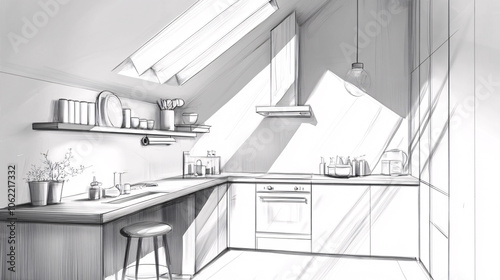 A detailed sketch of a small, minimalist kitchen with a breakfast nook, open shelving, and bright natural lighting from skylights.