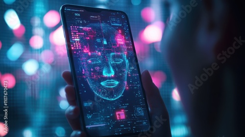 A detailed view of a phone showing a vibrant AI facial recognition interface, held upright by a user, with glowing data streams overlaying a dark, tech-themed background